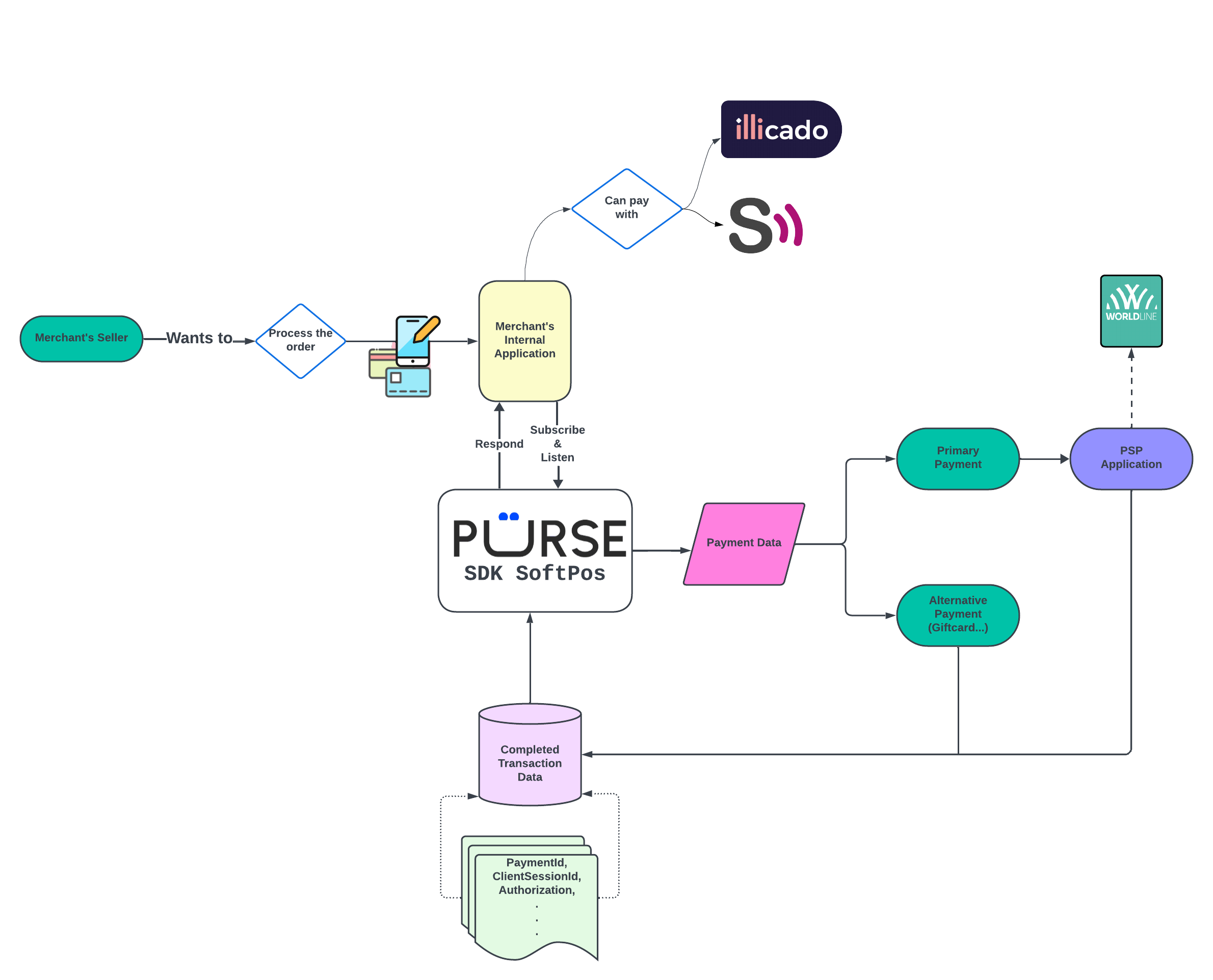 IntegrateAPIAdditional FeaturesPurse SoftPosOn this pagePurse Soft POS SDKWelcome to the Soft POS Purse page! This guide is designed to help you quickly integrate the Purse Soft POS SDK into your application. Installation Step 1: Obtain the .aar File Contact the Purse Integration Team to get the library in the form of a .aar file. Step 2: Add .aar File to Your Project Copy the .aar File: Place it into the libs directory of your Android Studio project. Create the folder if it doesn’t exist. Open build.gradle (Module: app)` Add dependency: implementation files('libs/PurseSdk.aar') Sync Gradle: Click "Sync Now" or use "File > Sync Project with Gradle Files" ProGuard Configuration If you are using ProGuard or R8, no additional configuration is required for the Purse SDK. The necessary rules are already bundled. You’re now ready to start using the SDK. Explore further to implement all features, or contact our support team if you need help. Overview of the Soft POS SDK This document provides an overview of how to integrate and use the Soft POS SDK in your mobile application. How Does the Soft POS SDK Work? Step 1: Create a Session To use our SDK, a valid client-session is required. Refer to the API Section for session creation. In the create-session response, you'll find the widget.data field: { "id": "f3abdc01-1dce-4663-ad02-7e65591e4cca", "widget": { "data": "aHR0cHM6Ly93d3cueW91dHViZS5jb20vd2F0Y2g/dj1kUXc0dzlXZ1hjUQ" }} Step 2: Initialize the SDK Initialize the SDK by creating a PurseSDK object: val purseSDK = PurseSDK() Then launch the SDK with: purseSDK.launch(widget.data, context) Step 3: Handle Transaction Status and Feedback Set a transaction listener: purseSDK.transactionListener = this Transaction End You receive a PurseRedirectionData object on completion: override fun transactionFinished(purseRedirectionData: PurseRedirectionData) {} Example: PurseRedirectionData( paymentId = "c920c394-1896-4179-b278-1503f37dd0dc", clientSessionId = "c9a3abdd-b583-415a-9b77-228891be74ed", authorizationStatus = AUTHORIZED, encoded = "eyJraWQiOiJiNzY5ODA5YS01ZTIwiOiJSUzI1_Q") Handling Errors override fun transactionError(error: PurseError) {} Example error: PurseError(message = "La session est invalide.")